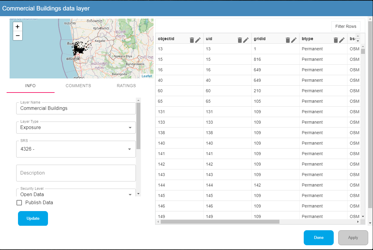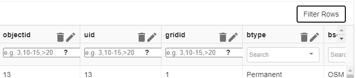 The grid view gives provides a view of the underlying data as provided in the spatial file that was imported. Often these files contain unreadable or not particulary insightful fields. You can therefore edit the "view" of the data which is made available once a layer is published. You can: